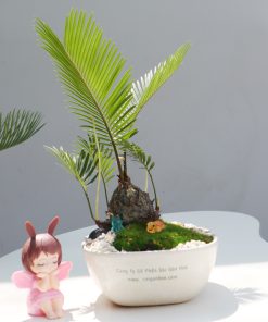 Cây Cau Tiểu Trâm được trồng vào chậu sứ trắng cùng với các phụ kiện trang trí, gắn một chiếc thiệp xinh xắn nhỏ gọn và đẹp mắt. Dồng thời gắm gửi thông điệp ý nghĩa đến với người nhận.
