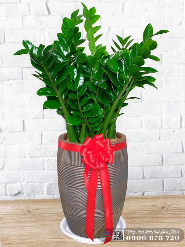 Cây kim tiền hay cây kim phát tài có thân mọng nước, lá màu xanh bóng và dày, trồng trong chậu đá mài sọc đồng, được gắn thêm nơ bảng sang trọng, phù hợp để làm quà tặng các dịp như khai trương, tân gia, động thổ hay cất nóc.
