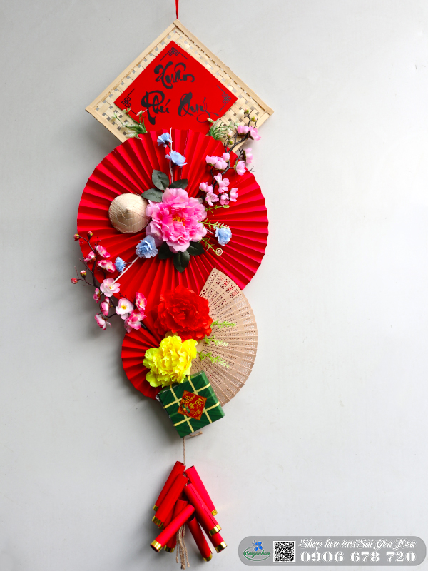 - Set quạt đỏ trang trí Tết thường đi kèm với họa tiết như hoa mẫu đơn, hoa đào,bánh chưng hay các câu đối ý nghĩa, tạo không khí rực rỡ và vui tươi cho ngày Tết.