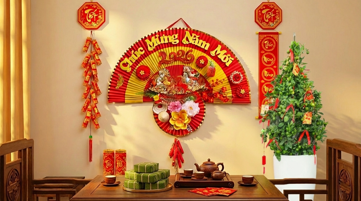 Set quạt đỏ chúc mừng năm mới không chỉ làm đẹp không gian mà còn tượng trưng cho sự may mắn, thịnh vượng trong năm mới.